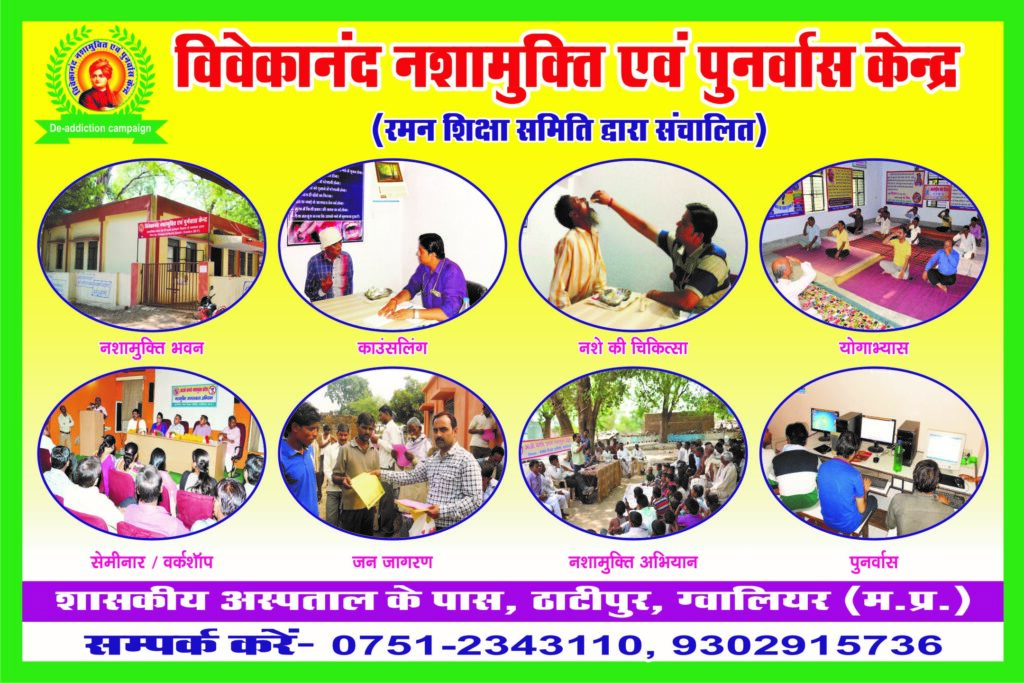 Vivekananda De-addiction and Rehabilitation Center was launched by Raman Shiksha Samiti on 11 April 2015 in Gwalior for the free treatment of intoxicated people. This de-addiction center was inaugurated by Honorable Mr. Jayant Malaiya, Finance Minister of Madhya Pradesh Government, the program was chaired by Hon’ble Mrs. Maya Singh, Minister for Women and Child Development of Madhya Pradesh Government. Gwalior Collector Mr. P.Narhari, GDA President Mr. Abhay Chaudhary, Gwalior Special Area Authority Chairman Mr. Jaisingh Kushwaha, BJP District President Mr. Devesh Sharma, Mr. Vinod Sharma and Institution President Mr. Hariom Gautam were specially present.
