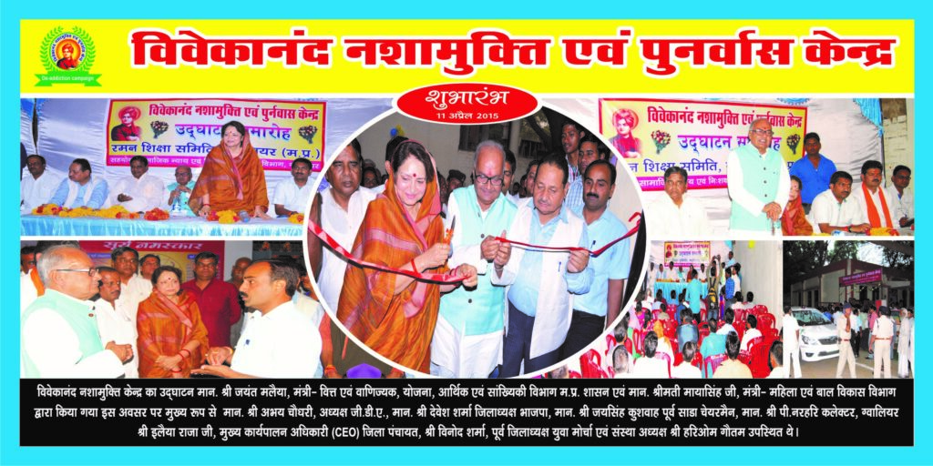 Vivekananda De-addiction and Rehabilitation Center was launched by Raman Shiksha Samiti on 11 April 2015 in Gwalior for the free treatment of intoxicated people. This de-addiction center was inaugurated by Honorable Mr. Jayant Malaiya, Finance Minister of Madhya Pradesh Government, the program was chaired by Hon’ble Mrs. Maya Singh, Minister for Women and Child Development of Madhya Pradesh Government. Gwalior Collector Mr. P.Narhari, GDA President Mr. Abhay Chaudhary, Gwalior Special Area Authority Chairman Mr. Jaisingh Kushwaha, BJP District President Mr. Devesh Sharma, Mr. Vinod Sharma and Institution President Mr. Hariom Gautam were specially present.